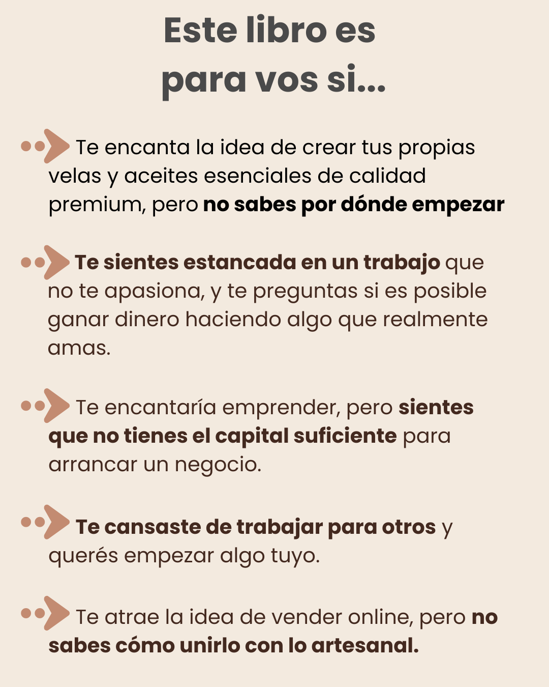 No, este libro es para cualquier mujer que quiera empezar a crear y vender velas de calidad premium, sin importar su nivel de experiencia. Si eres principiante, te llevaremos de la mano desde cero. Si ya tienes algo de experiencia, descubrirás técnicas avanzadas, secretos de marketing y una estrategia probada para convertir tu pasión en un negocio rentable.